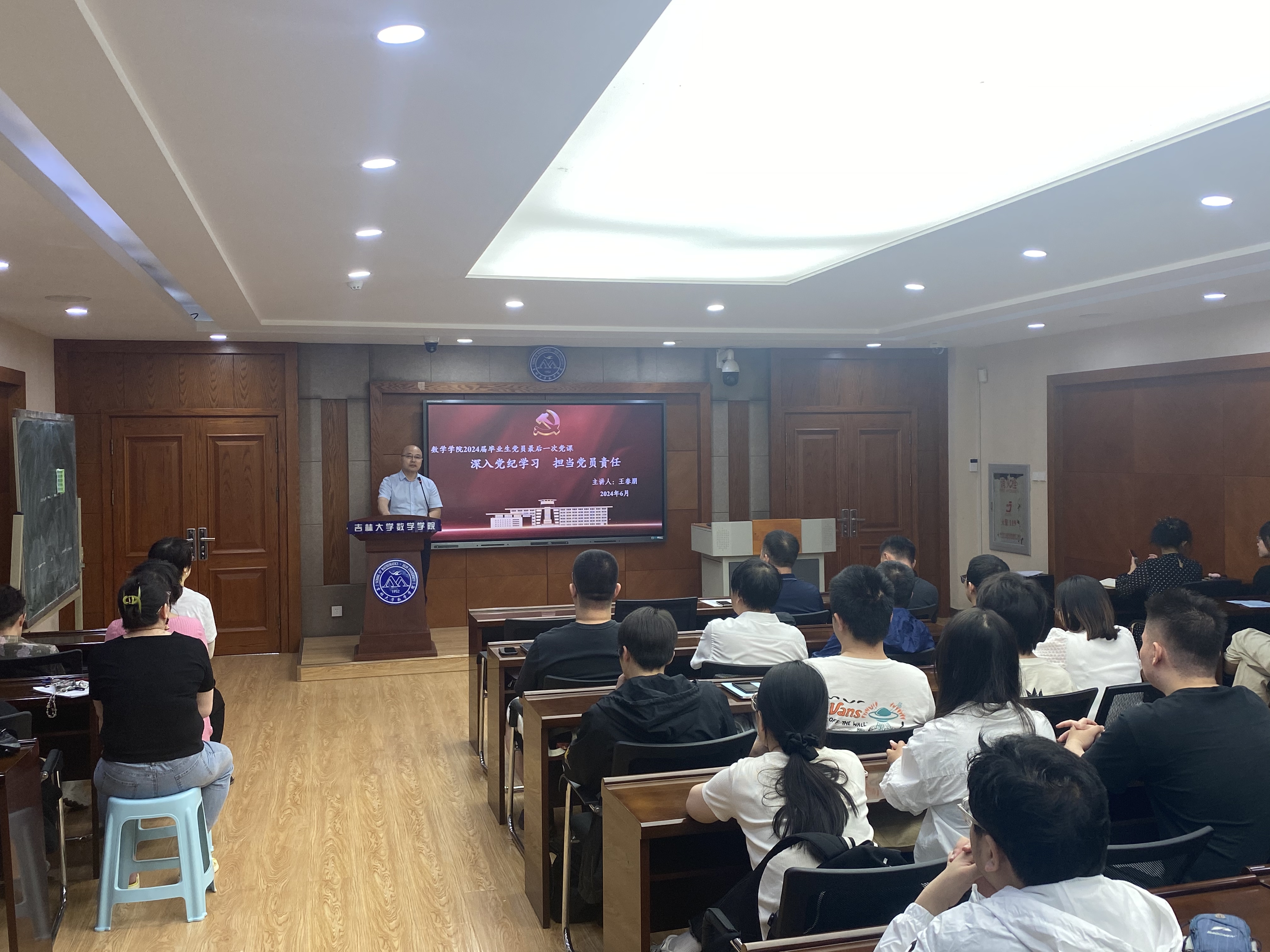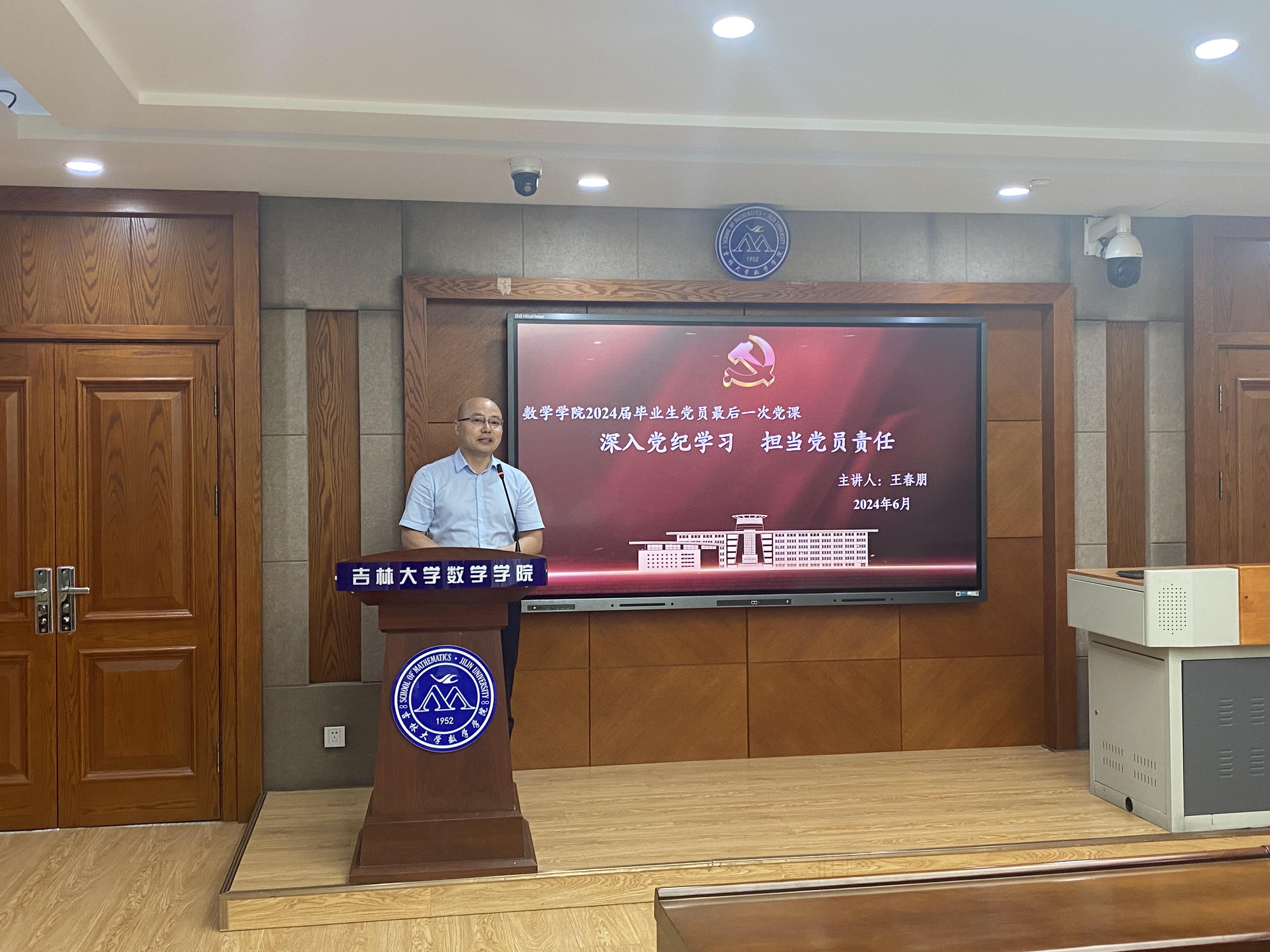 为推动党纪学习教育走深走实,教育引导全体毕业生党员增强纪律意识,在知敬畏、存戒惧、守底线中夯实理念信念之基,在推进强国建设、民族复兴伟业中展现青春作为、彰显青春风采、贡献青春力量。6月17日,黄色网站 党委书记王春朋为2024届全体毕业生党员讲授了毕业前“最后一次党课”。
