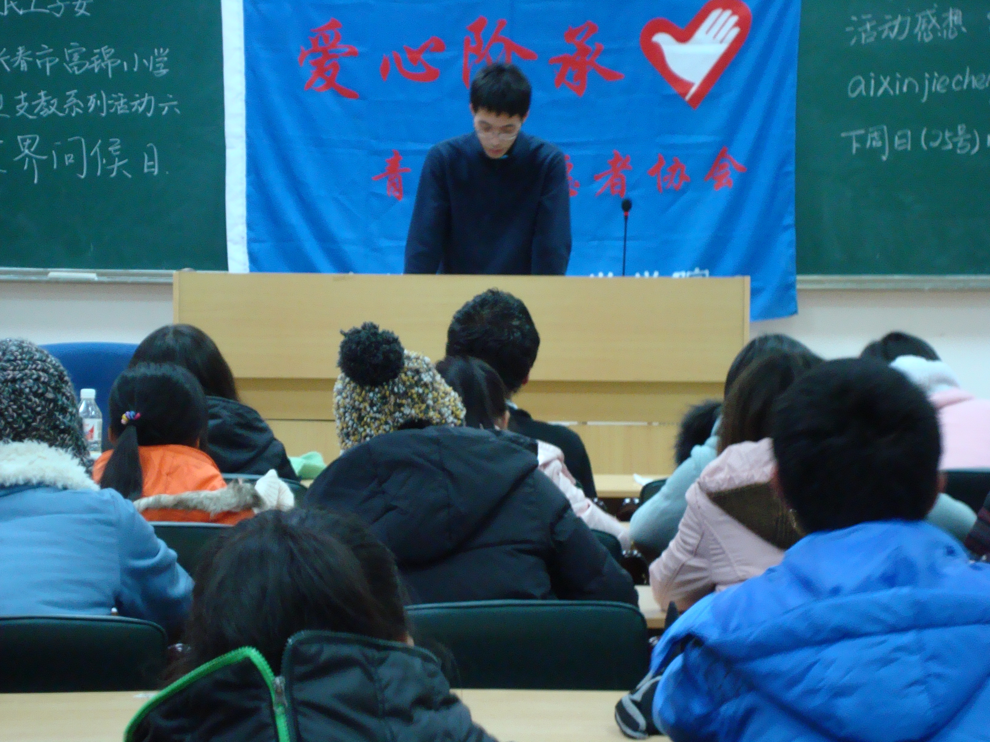 2012年11月15日晚6点,黄色网站 爱心阶承青年志愿者协会在数学楼一楼报告厅举办了“走进长春市富锦小学--大型支教活动”系列之第六届“世界问候日”主题活动的志愿者培训。