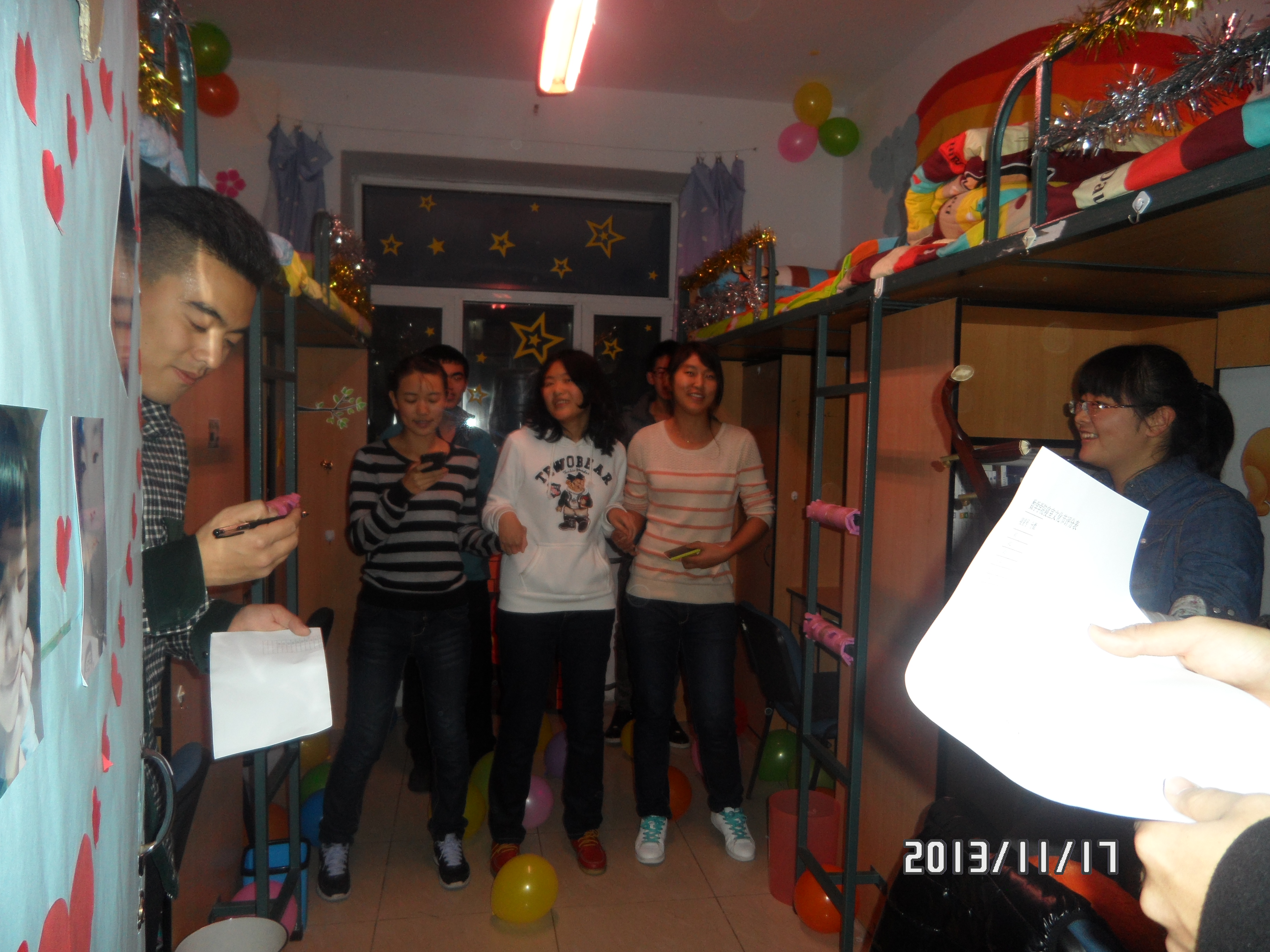 首先,女综部部员做了简单的开场白,随后陪同评委开始对各寝室进行参观并评分。同学们都围绕各自的主题进行了精心的准备。各具特色的装扮设计得到了评委们的赞赏,精彩的表演更是赢得评委们的阵阵掌声。部分寝室和男同学们进行了联谊,气氛十分温馨。将近两个小时的活动过程中,同学们都各显才华,评委们笑声不断。最后活动在掌声中圆满结束。