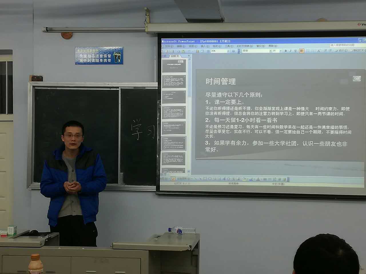 晚六时,主持人宣布交流会开始。首先是王震学长发言。他分析他人,剖析自己,分享了自己大学学习生活的时间规划方案,强调了坚持良好学习习惯的重要性,生动幽默地讲述了许多高效的学习方法和技巧,引人入胜。李忠学长深刻的发言同样发人深省,他从自身经历出发,建议同学们尽早树立长远目标,尽快进入学习正轨,学长苦中有乐的学习生活就是同学们最好的榜样。最后是咨询问答环节,气氛轻松活跃,同学们踊跃提问,学长详细答复。