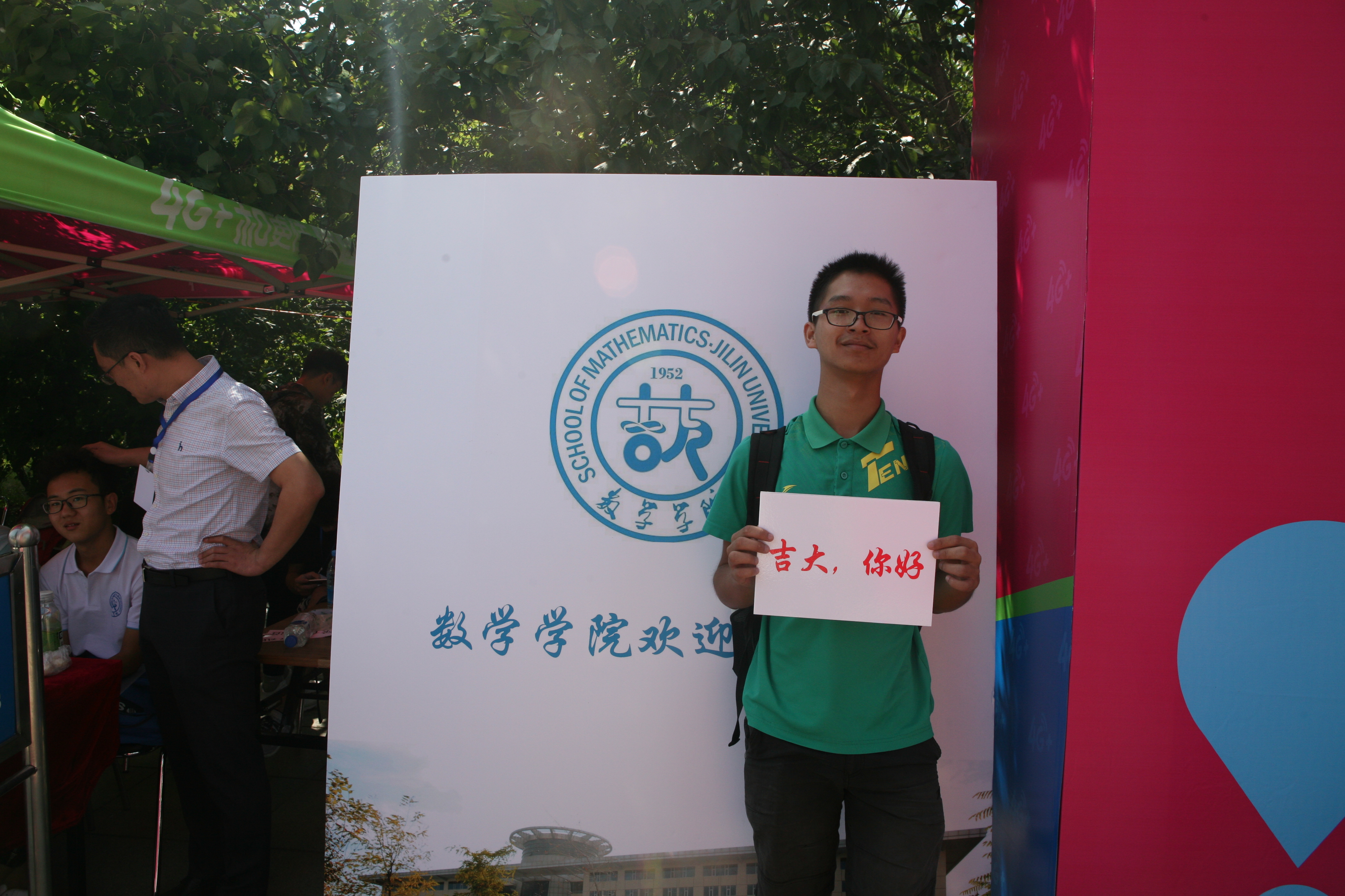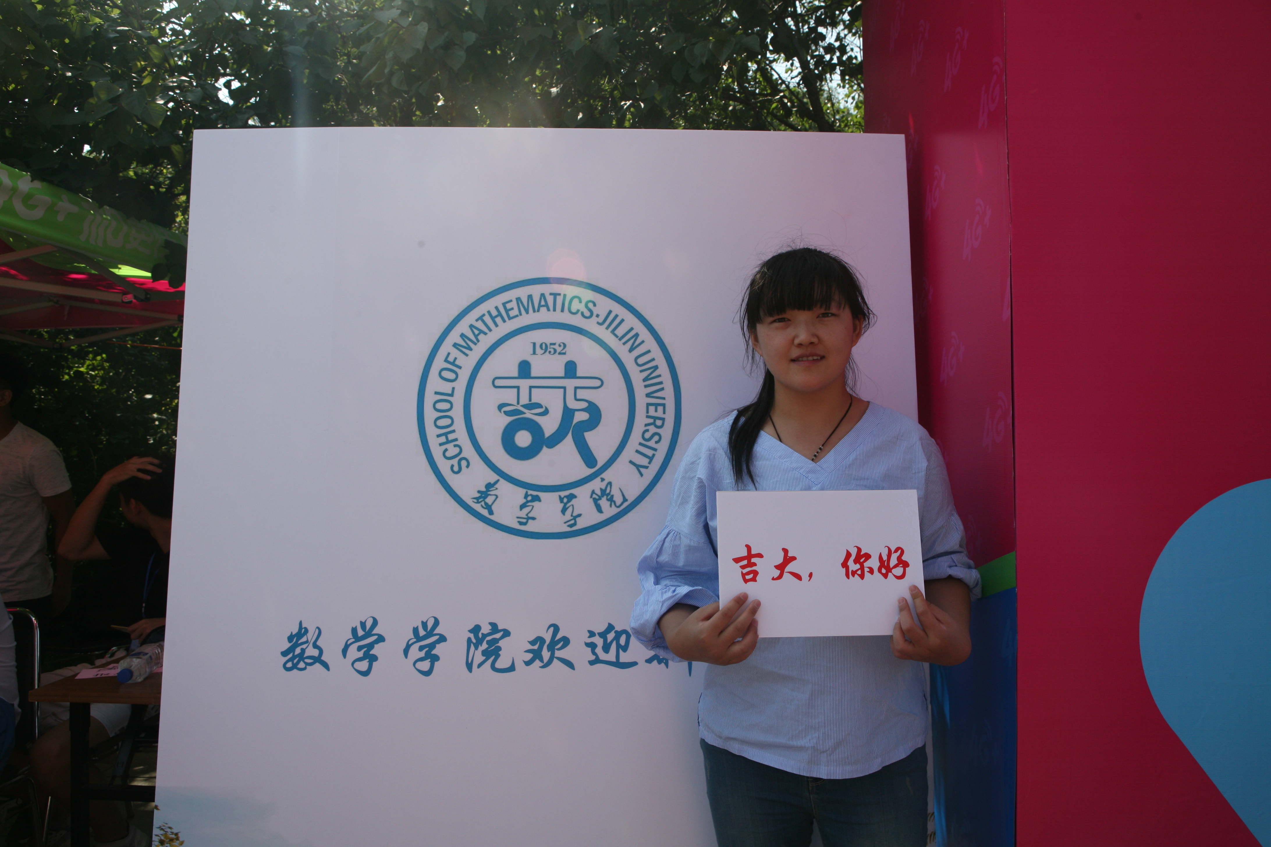 迎新期间,17级数院新生都会将签好名字的便签贴在印有院徽的宣传板上,之后举着写有“你好吉大”、“以梦为马,不负韶华”等标语的手牌拍照留念,怀着对大学生活的憧憬,将最美的笑容定格。