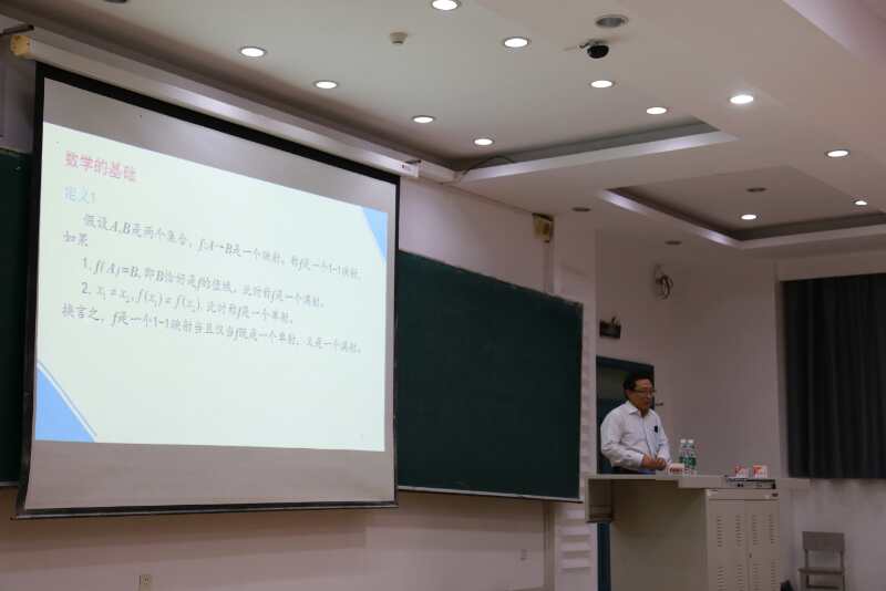 李辉来院长就“数学的基础”、“数学的质量”、“身边的数学”、“数学的基数”、“数学的道理”、“数学的电影”六部分进行讲解。“数学的基础”部分,李院长引用生活中的实例推广到无穷向同学们论述了数学上的基础概念“多与少”并提出:无穷是数学的基础和本质,是数学味道的精髓。