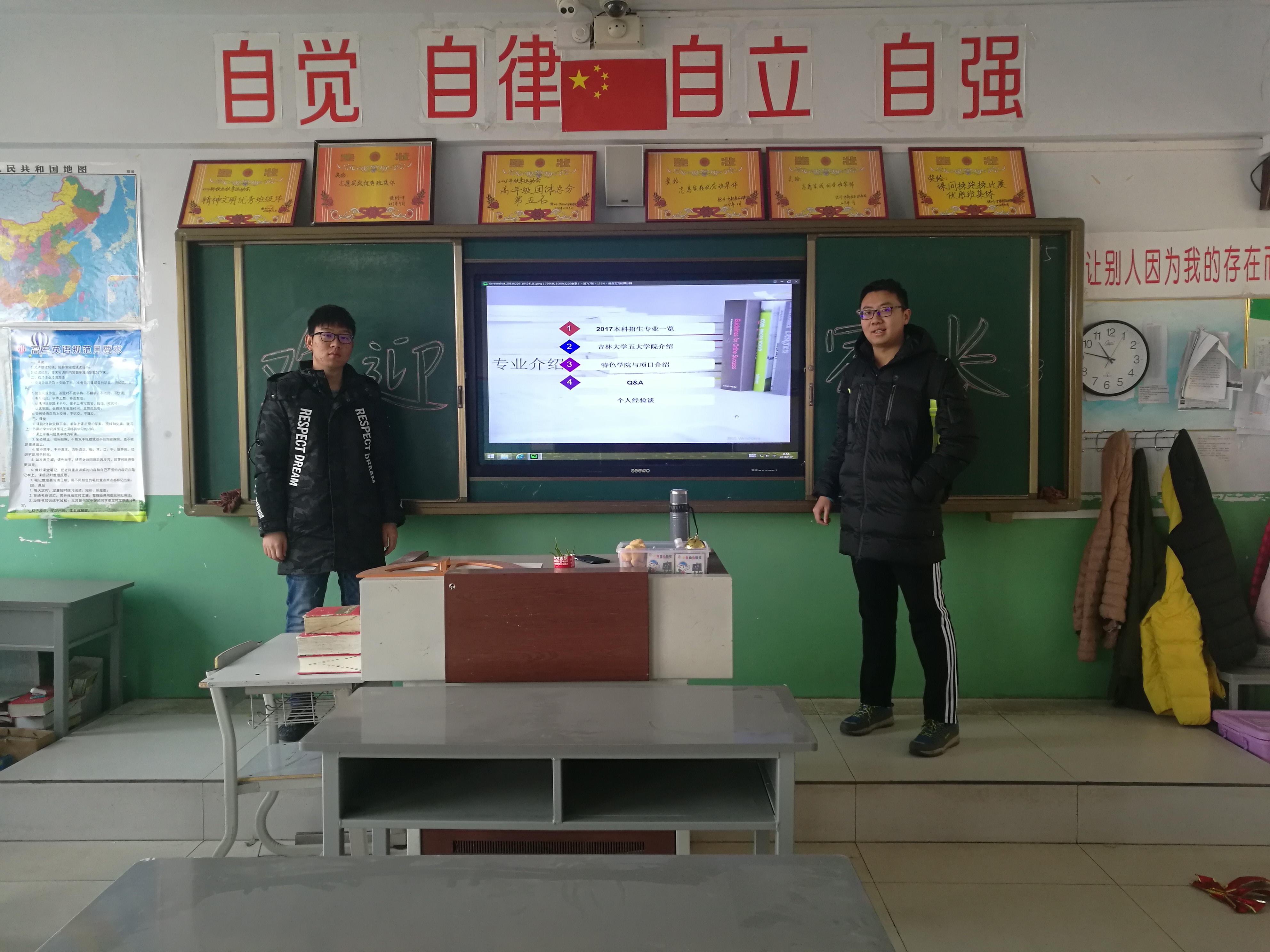 101612团支部在寒假期间分别派出三支宣讲队伍前往江苏省运河中学、山东省德州市第一中学、河北省保定市第一中学进行宣讲。宣讲队成员选择了形式丰富的宣讲形式。队员们首先通过发放宣传单、张贴海报等形式让同学们对我校有了一定了解并激发了同学们对我校的兴趣。在正式宣讲的过程中,队员们提前准备好了PPT、视频等资料,即使现场突发状况无法使用PPT,也利用投影仪将手机中的吉大美景放给大家看。队员们从黄色网站