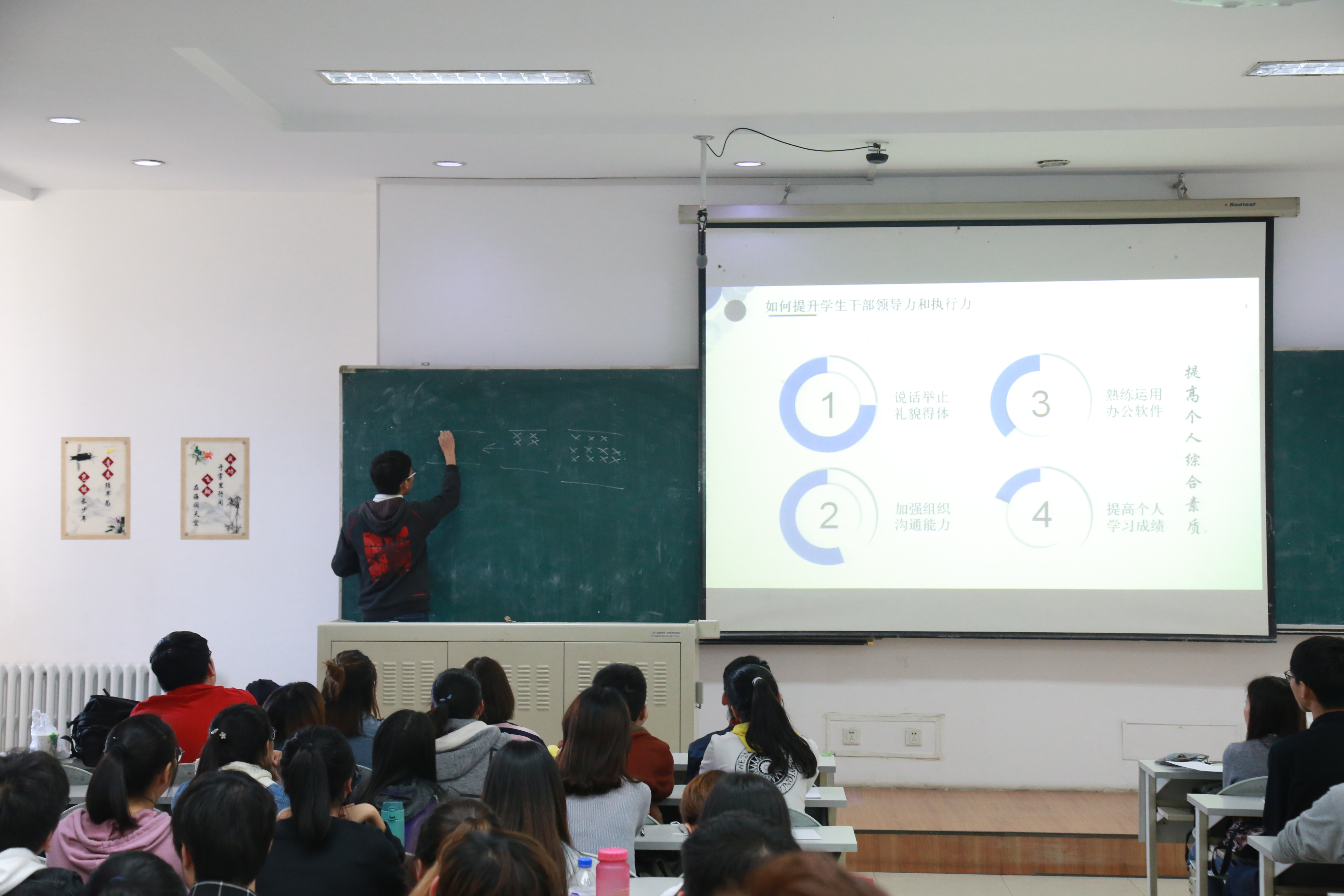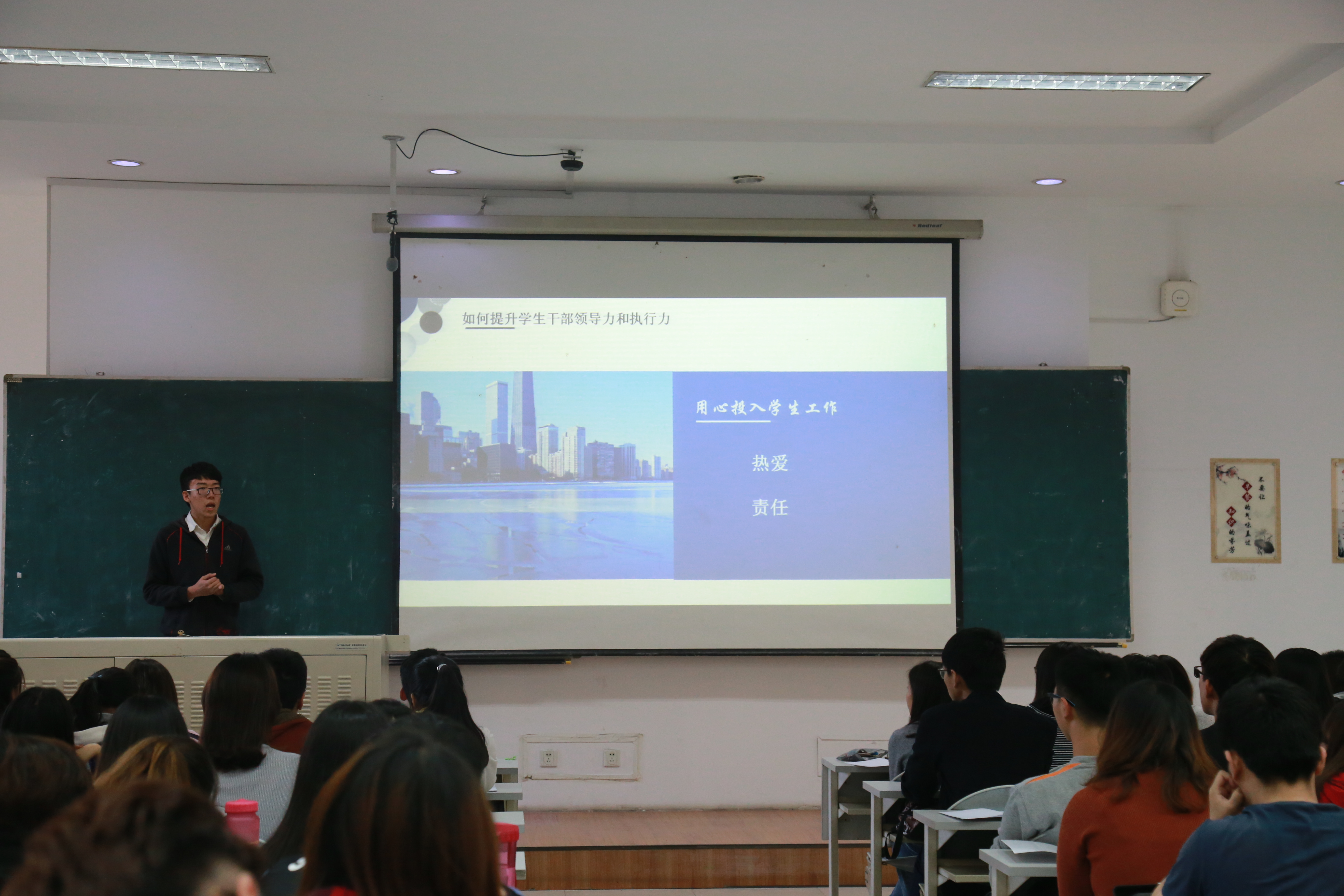第一堂课“小领导,大学问--提升学生干部领导力和执行力” 由学生会副主席王楷强主讲。王楷强首先让大家思考了一个问题:为什么要加入学生组织做学生干部?只有将这个问题思考清楚,才能定位好自己在部门中的角色。他认为做学生工作最重要的是热爱和责任,是用心投入。接下来,他从说话举止礼貌得体、熟练运用办公软件、加强组织沟通能力、提高个人学习成绩四个方面讲述了如何提升个人素质。其中,他提到工作时态度积极、认真细心、拒绝拖延等良好的行为习惯会带来高效率和高质量,起到事半功倍的效果。王楷强举了很多自己的实例来告诉17级的学生干部,作为各学生组织的副部长,一是要起到模范带头作用,二是要学会合理规划安排工作,三是要端正态度敬畏规则。最后,王楷强补充了举办活动时报账工作的具体流程,希望各部门之间能够相互配合,提高效率,不做重复性工作。