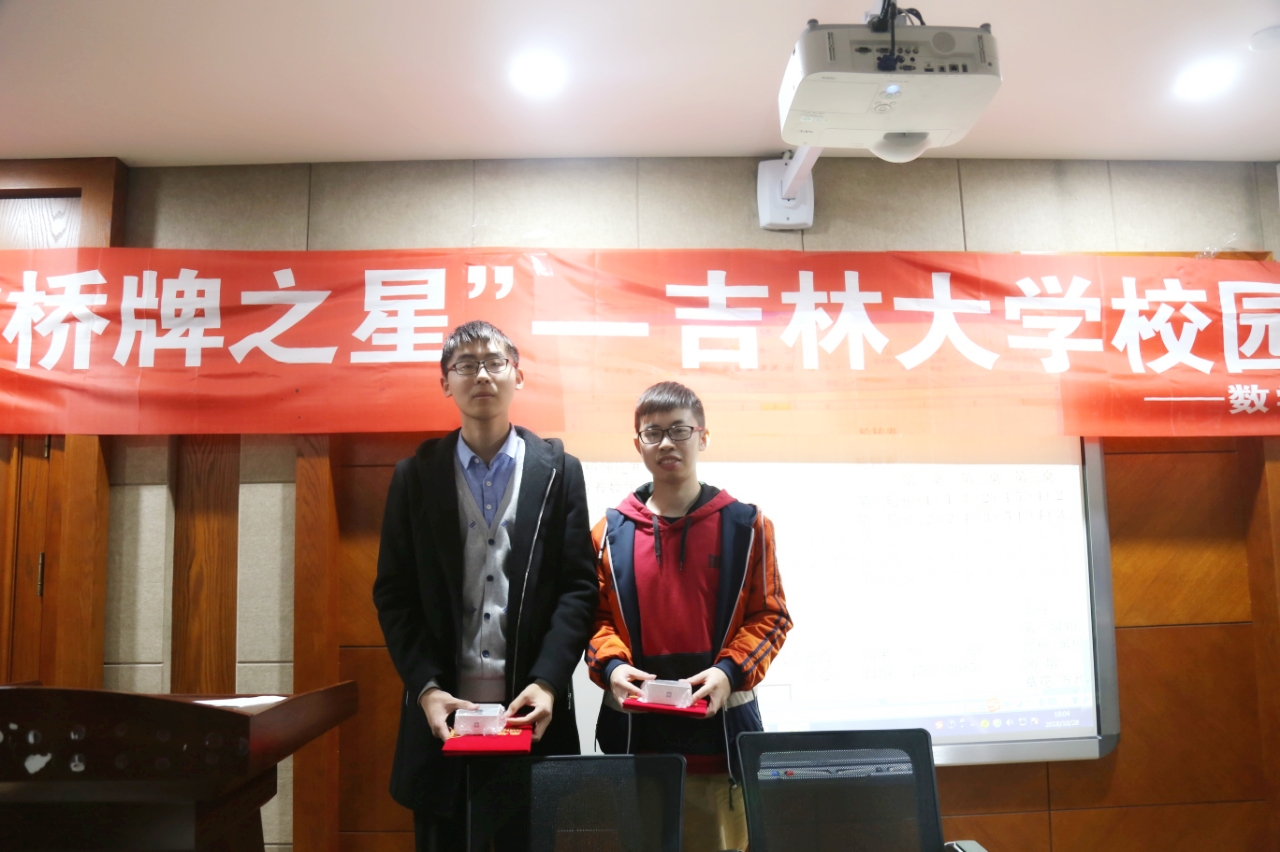 经过将近四个小时的激烈角逐,比赛结束。裁判裁决胜负后,由评委长春市桥牌协会副主席姚连钰为获胜者颁发礼品,为参赛者颁发证书。“牛刀小试组”一等奖由吴林浩同学,彭颜德同学获得,“大显身手组”一等奖由刘溯,王志铭同学获得。