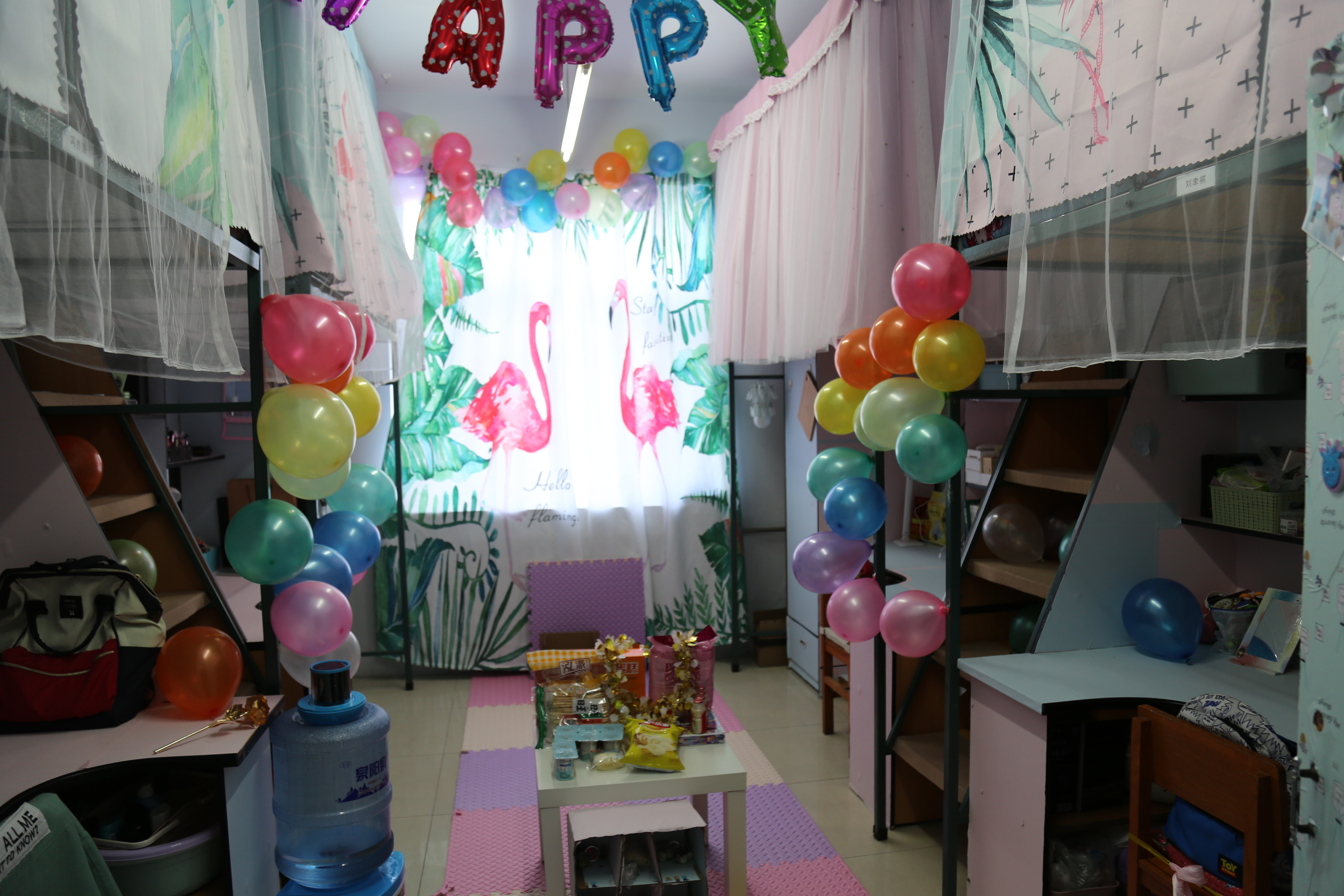 一至四楼走廊部分由学生会女生部负责,受到了各院女生的一致夸赞。18级女生寝室各具特色,装饰的十分用心,走廊内的照片墙记录了同学们开学以来的点点滴滴,每间寝室都制定了自己的小目标,并有了自己寝室独特的名字,想象力十分丰富。有的宿舍在走廊的墙面上放了一点糖果,给大家品尝;有的宿舍装饰成了城堡,十分梦幻。活动现场气氛非常热闹,男女生联谊表演节目,弹电子琴、唱歌、跳舞等,十分精彩,大家都兴致盎然。
