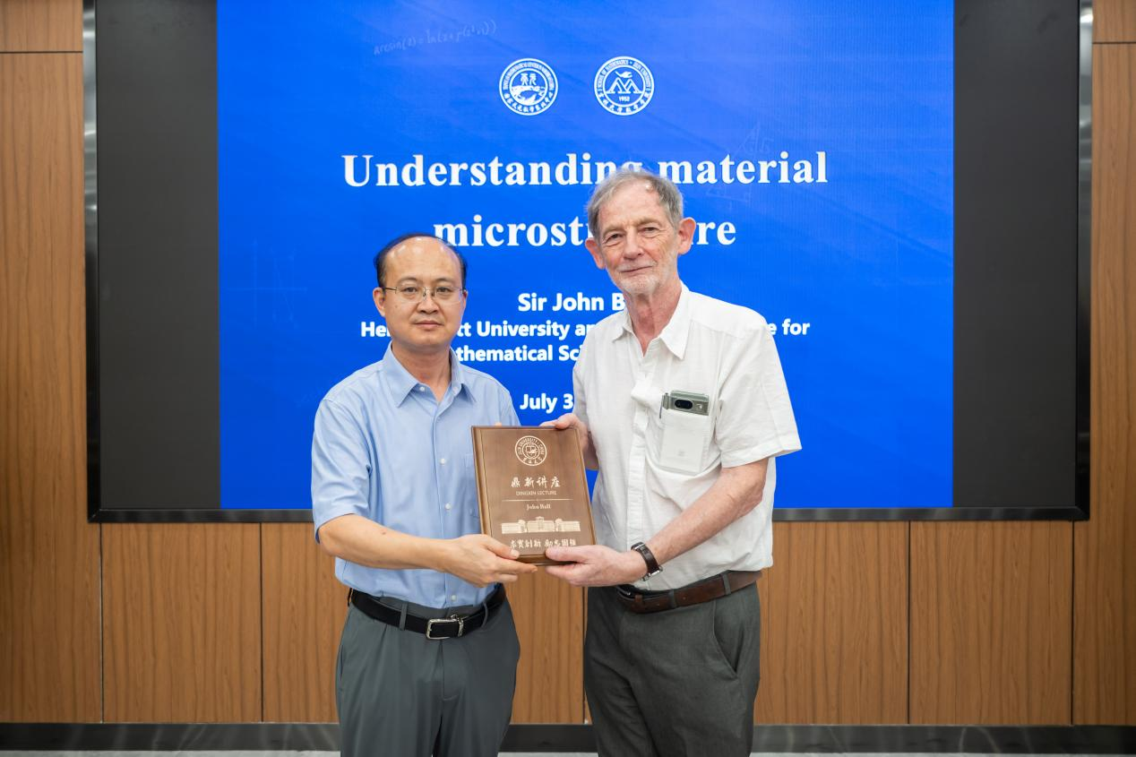On July 31, 2024, Sir John Ball, Fellow of the Royal Society, Academician of the European Academy of Sciences, Fellow of the American Mathematical Society, Fellow of the Royal Society of Edinburgh, Foreign Member of the French Academy of Sciences, and Foreign Member of the Norwegian Academy of Science, delivered a lecture at Jilin University’s Dingxin Lecture Series. Titled "Analyzing Microstructures in Materials," his talk provided cutting-edge academic insights and inspiration to Jilin University faculty and students. Professor Zhang Guoxing, Vice President of Jilin University, attended the lecture and presented the "Dingxin Lecture Commemorative Plaque" to Professor John Ball.