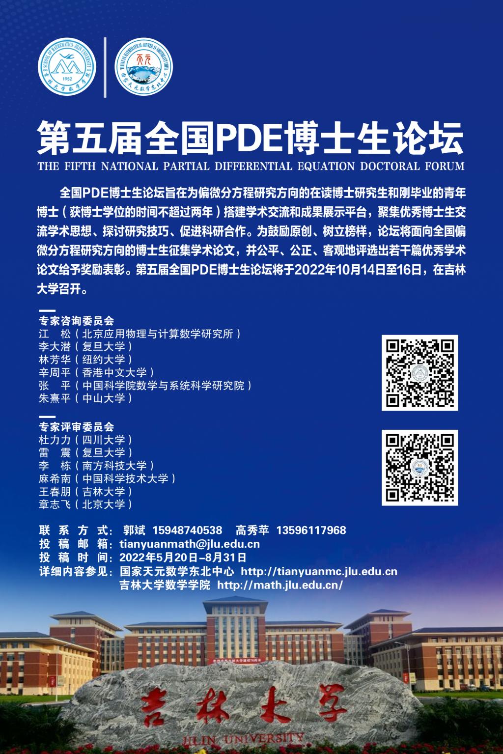 将于2022年10月14日至16日举办“第五届全国PDE博士生论坛”,我们诚挚地邀请全国偏微分方程方向的博士生及青年博士参加本次论坛。