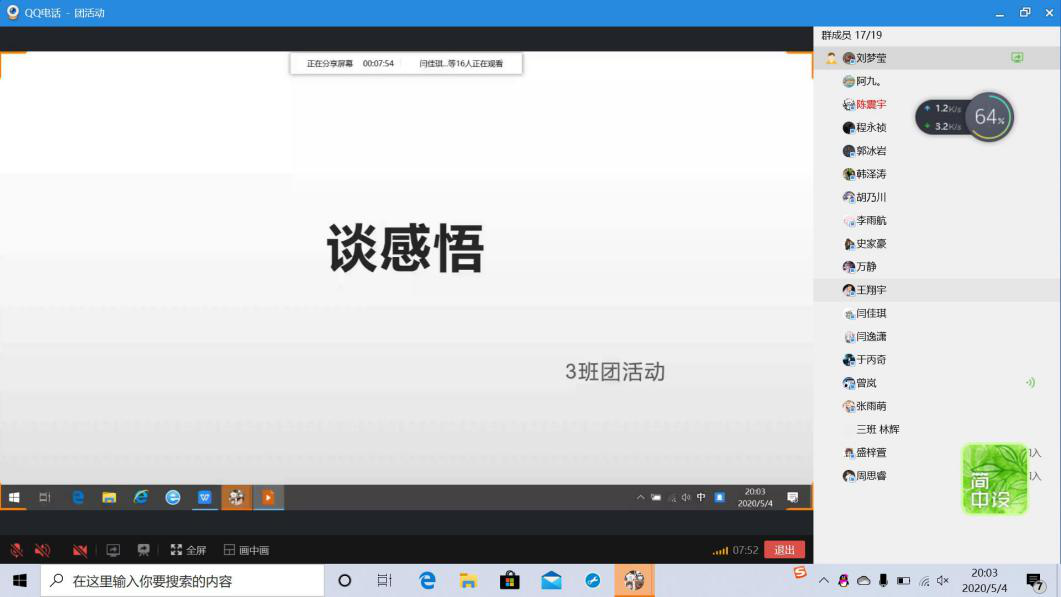 在这次活动中,同学们首先讨论了大家在疫情期间的学习生活。疫情期间,同学都有很好做到对自己与家庭的隔离与防护,同时也时时刻刻关注着国内和世界疫情的发展状况。之后,我们便讨论了许多疫情期间的先进事迹,有在一线奋战的人们,更有在我们生活中的“普通人”。我们明白了只有全国上下一心共渡难关,才有我国疫情形势的好转,这是每一个人的努力相加所得的。最后班长总结:作为新时代的青年,要牢记习近平总书记的“青年一代有理想、有本领,有担当,国家就有前途,民族就有希望”。关键时刻、危难关头,青年们不畏艰险繁难认真履职尽责,为疫情防控斗争作出重要贡献。同学们要向他们学习,接过他们手中的旗帜,以在自己的岗位上,在党和人民最需要的地方绽放绚丽之花。