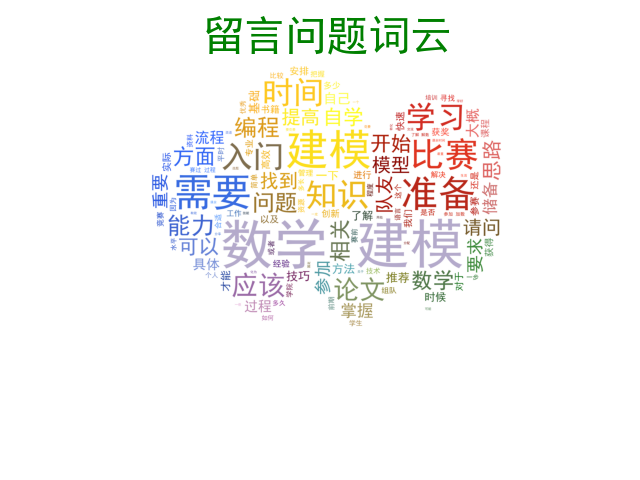 大会开始后,主持人先将大家所关心的焦点问题提炼成词云图,直观地呈现在主讲同学面前。随后,王佳宇、宋志翔、欧炜庭、纪量、张荣德、贾林瀚、徐勐、谢子怡、任奕璇等九位曾在国赛或美赛中获奖的同学上台针对性地分享建模经验。这些同学来自多个学院,他们用独特的观点分享了自己的经历并提出多项可行建议。