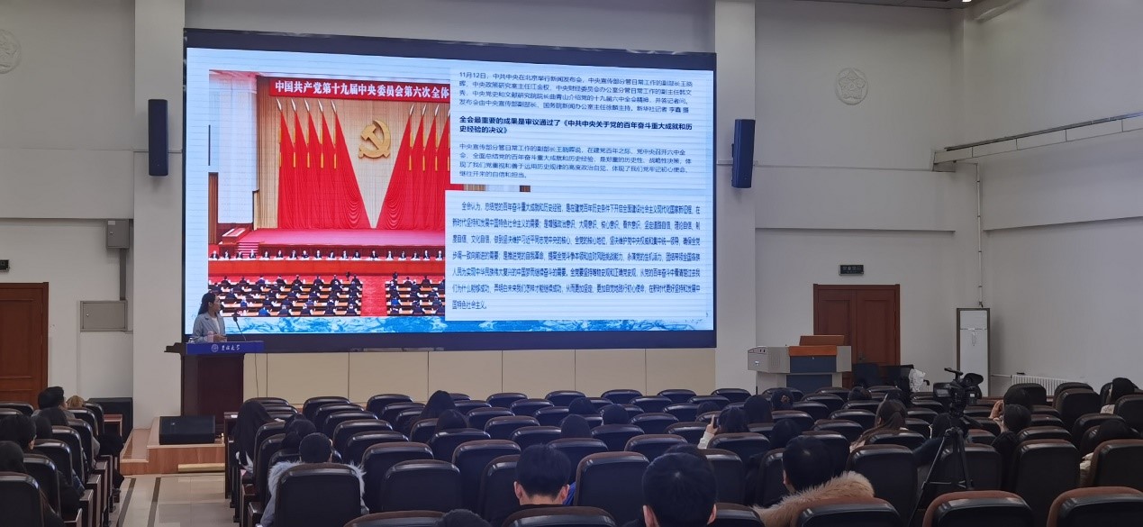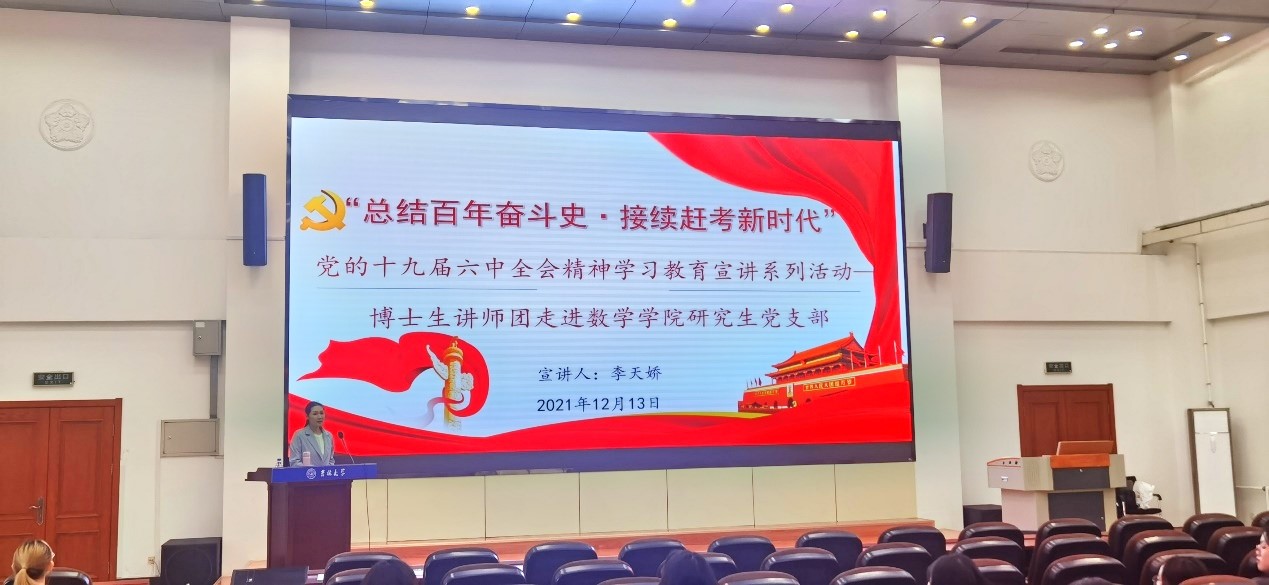 为深入学习贯彻党的十九届六中全会精神,提升广大研究生思想政治素质,积极响应校党委研究生工作部工作要求,2021年12月13日,黄色网站 邀请黄色网站 博士生讲师团讲师李天娇博士于数学楼二楼报告厅进行了十九届六中全会精神学习教育宣讲。本次宣讲的主题为“总结百年奋斗史•接续赶考新时代”——新中国以来国家领导人新闻发布的机制演变与基本经验”,学院研究生党支部党员、预备党员、积极分子参与了此次宣讲活动。
