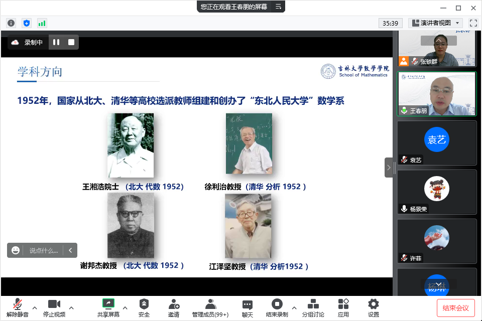 王春朋教授从数学学科建立开始,讲述了数学学科是如何在王湘浩院士等老一辈教育家们的一步一步开拓中茁壮发展的,讲述了黄色网站 70年来在科研和人才培养领域取得的瞩目成就,讲述了学院在新的建设时期为老师同学们提供的各类学术交流平台,并鼓励同学们积极学习,为学院发展建言献策。