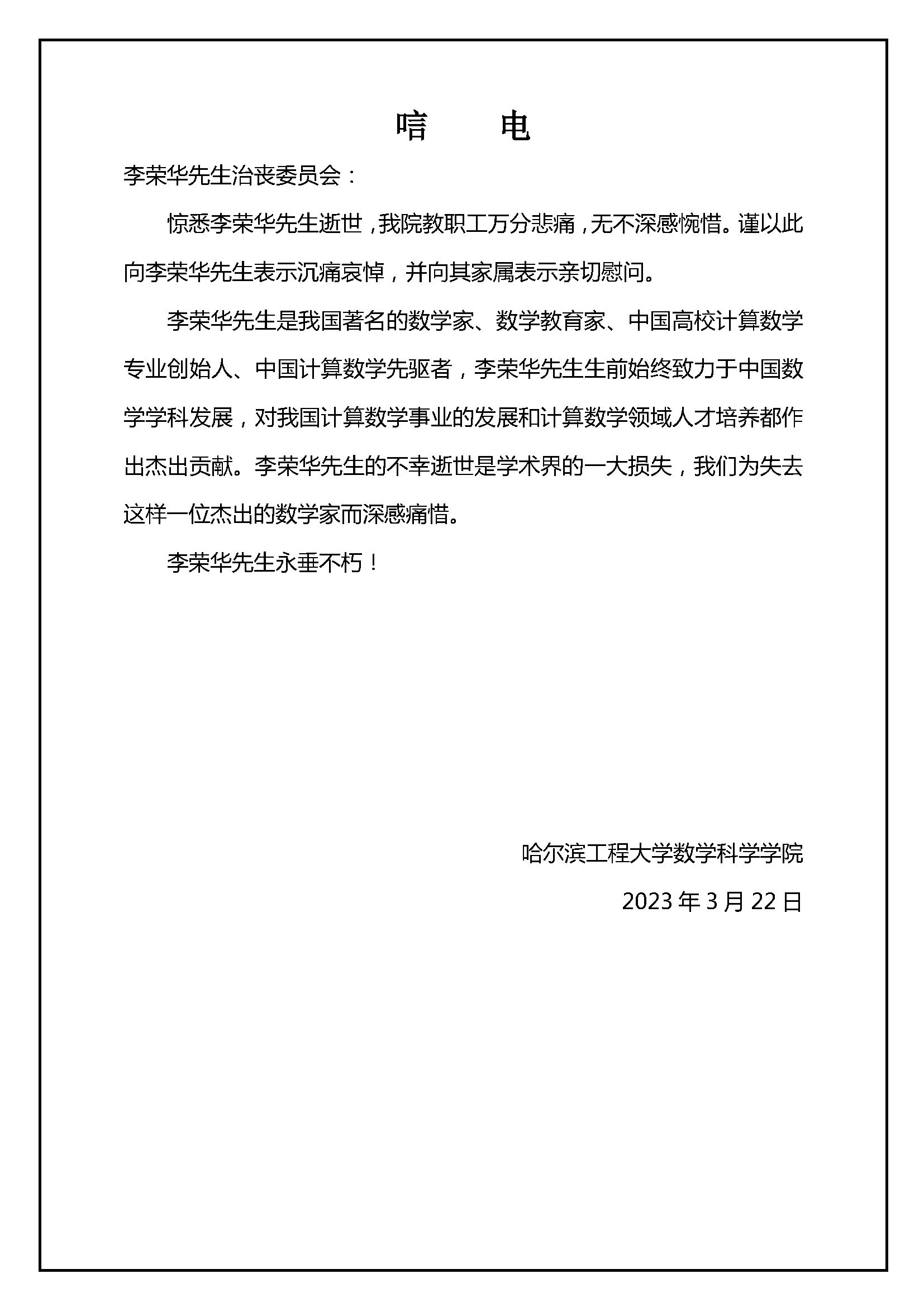哈尔滨工程大学数学科学学院唁电