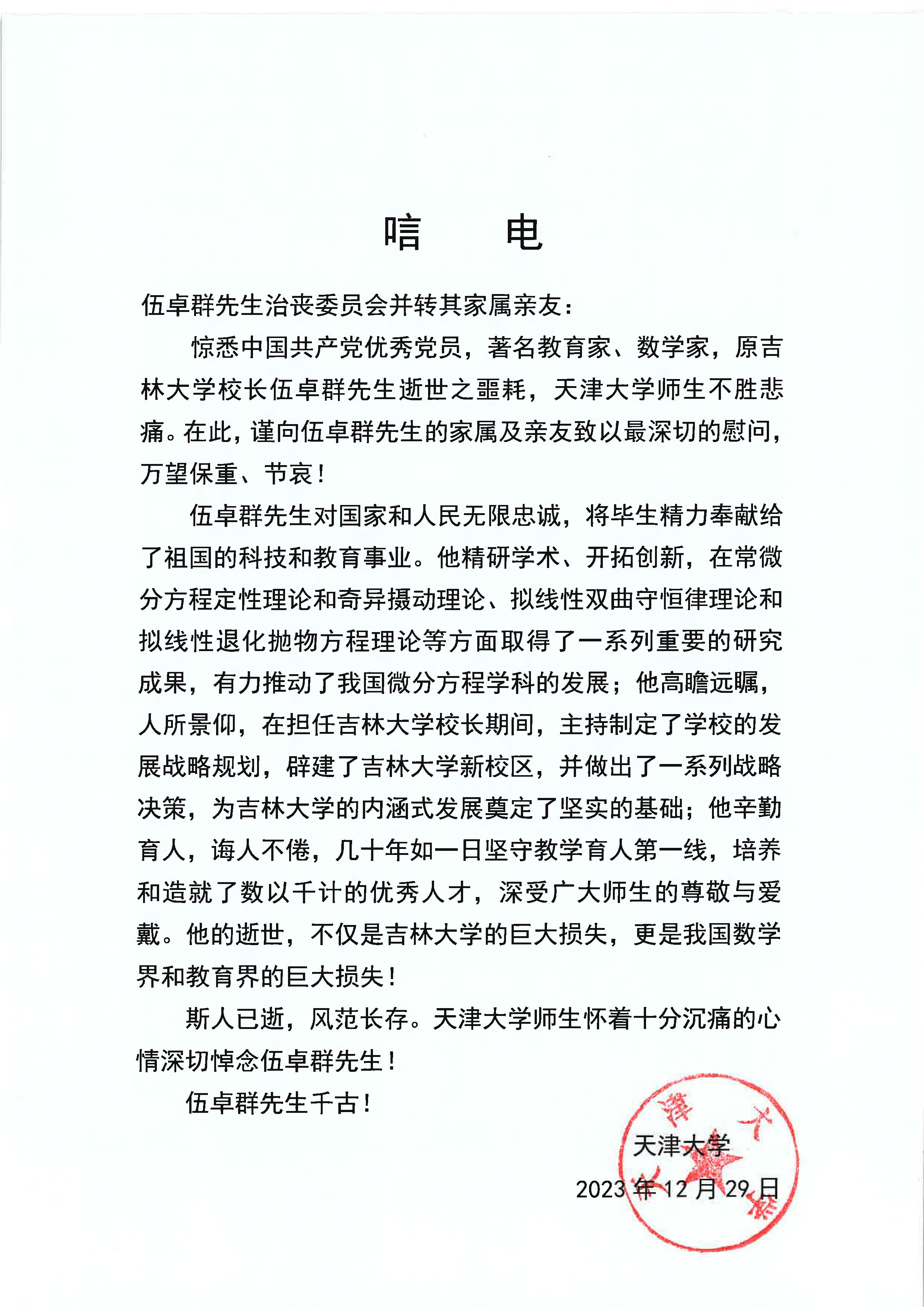 天津大学唁电