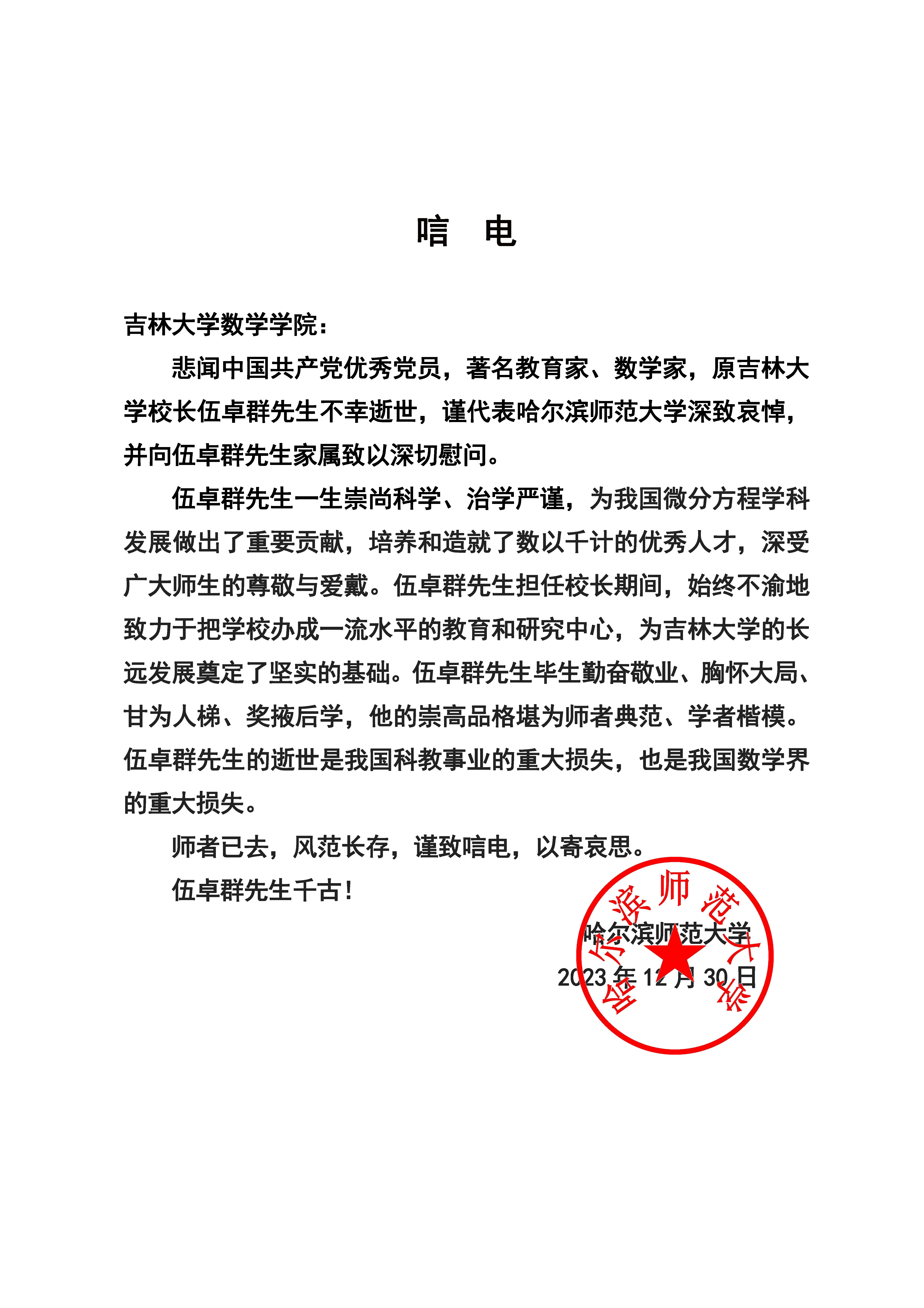 哈尔滨师范大学唁电