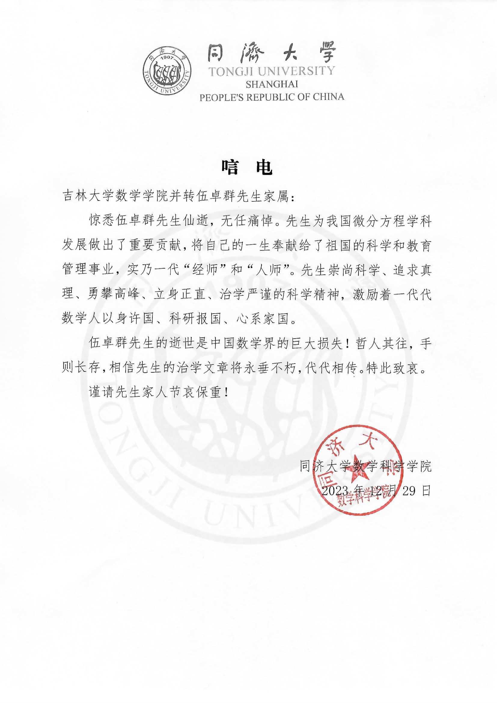 同济大学数学科学学院唁电